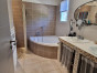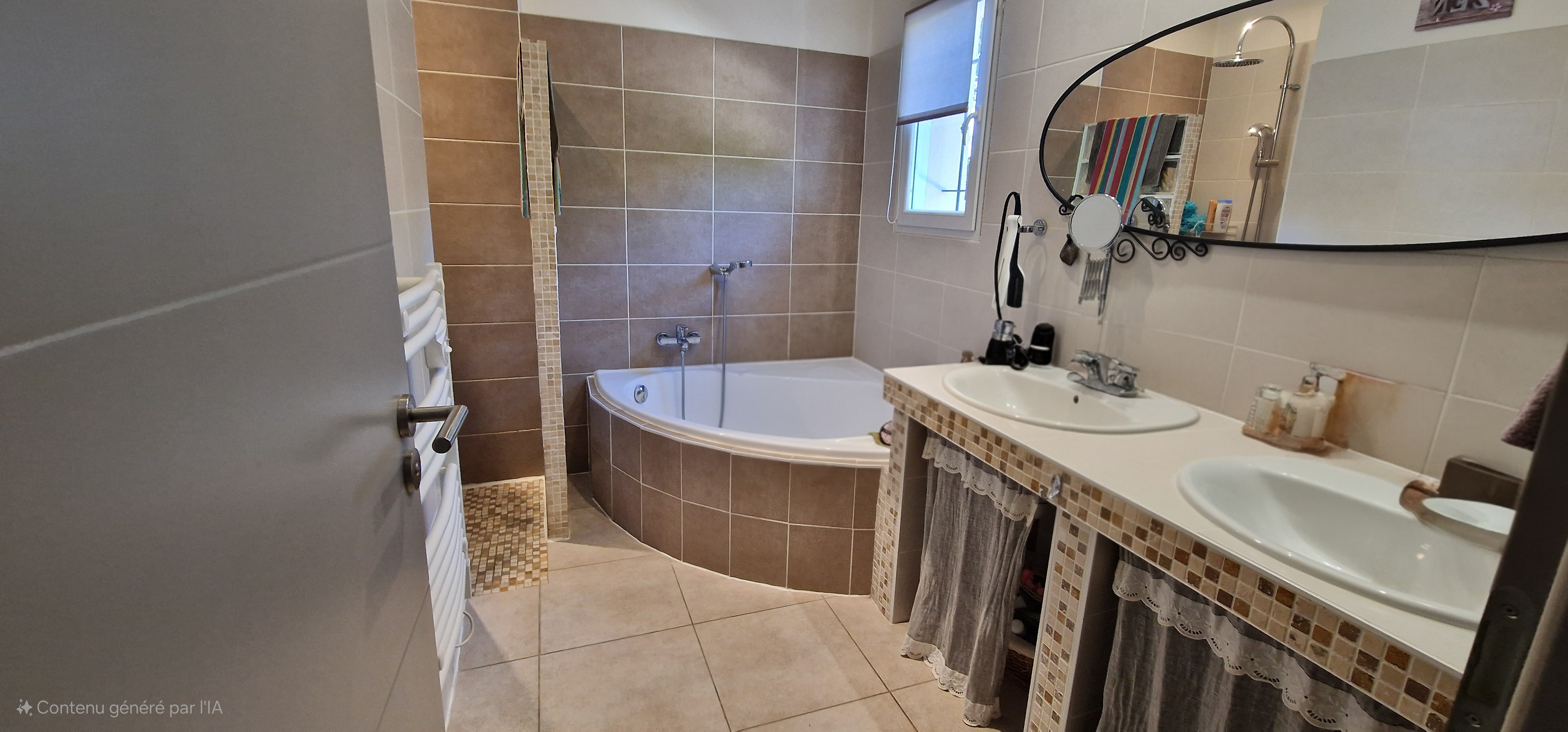 • Une salle de bains moderne avec double vasque, baignoire d’angle, douche à l’italienne, sèche-serviette et soufflant programmable,